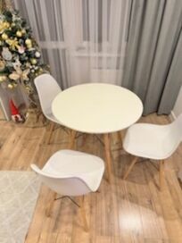 Przestronny salon: kanapa z funkcją spania, 2-drzwiowa szafa, okrągły stół z krzesłami, telewizor i szafka RTV