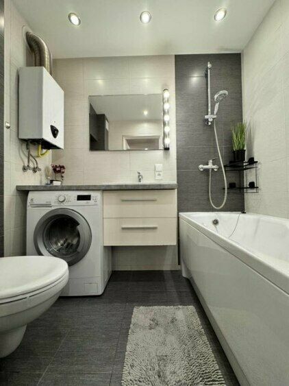 Łazienka: pralka, wanna, umywalka z szafką, lustro z oświetleniem.