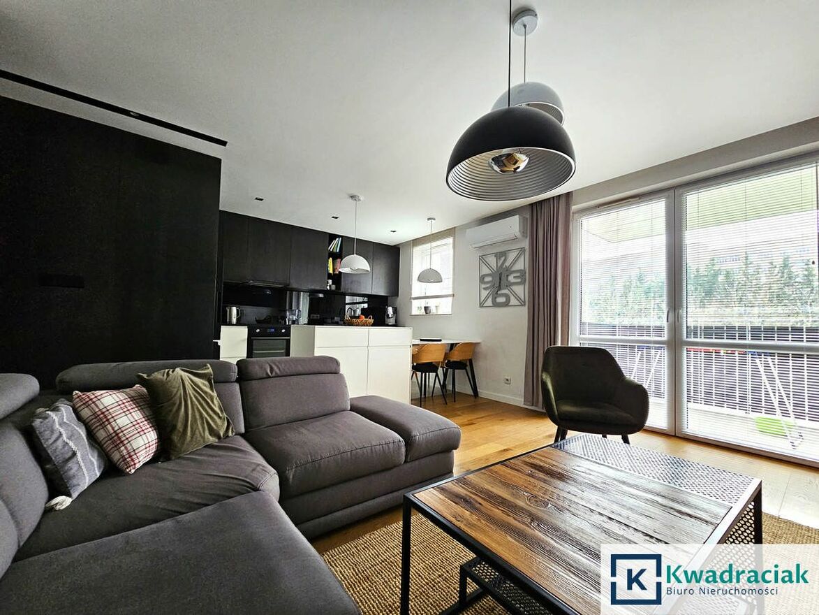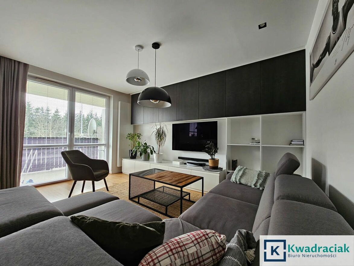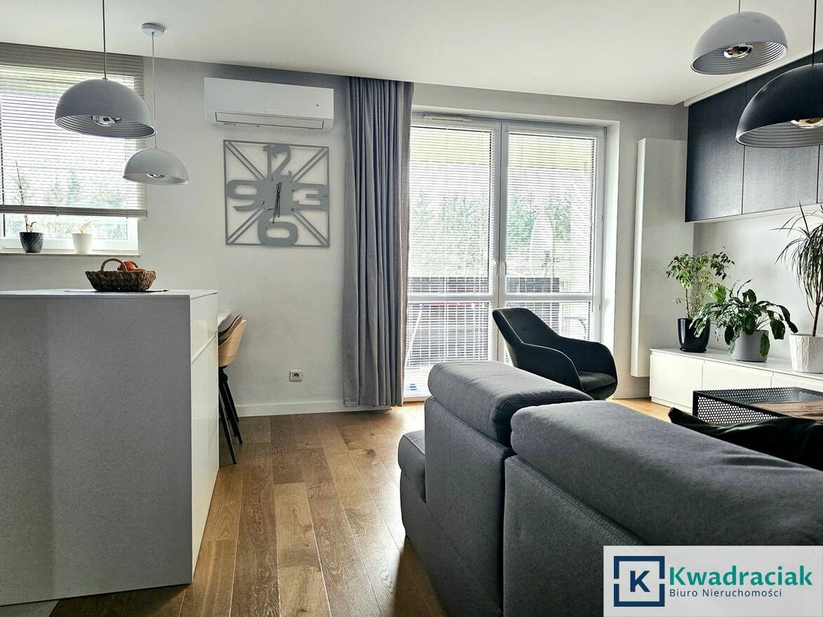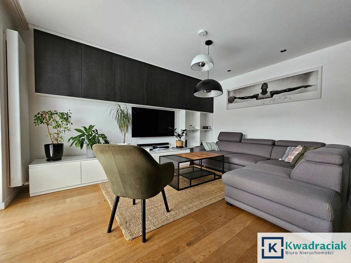 Mieszkanie o powierzchni użytkowej 67,47 m² znajduje się na parterze. Składa się z przestronnego salonu połączonego z kuchnią, z którego prowadzi wyjście na balkon o powierzchni 6,28 m², dwóch komfortowych sypialni, łazienki z ogrzewaniem podłogowym, oddzielnego WC również z podłogówką oraz korytarza z zabudową. Dodatkowym atutem jest duży, aż 63-metrowy taras, komórka lokatorska o powierzchni 4,26 m² oraz miejsce postojowe w garażu podziemnym. Mieszkanie jest wykończone w wysokim standardzie - umeblowane meblami wykonanymi na wymiar, wyposażone w kuchnię z marmurowym blatem, a na podłogach znajdują się drewniane panele Baltic Wood. Lokal jest klimatyzowany. Bardzo dobry stan oraz wysoka jakość wykończenia sprawia, że mieszkanie jest gotowe do wprowadzenia bez dodatkowych nakładów.