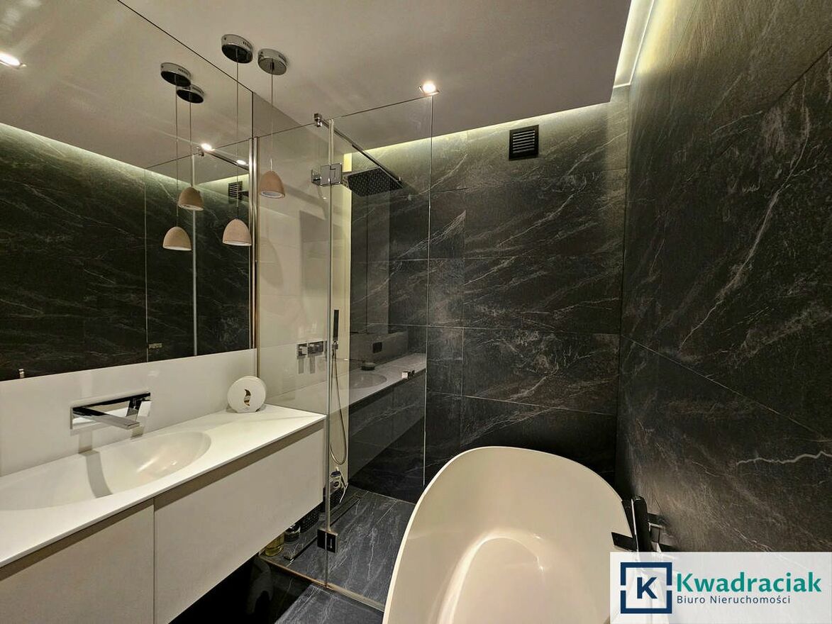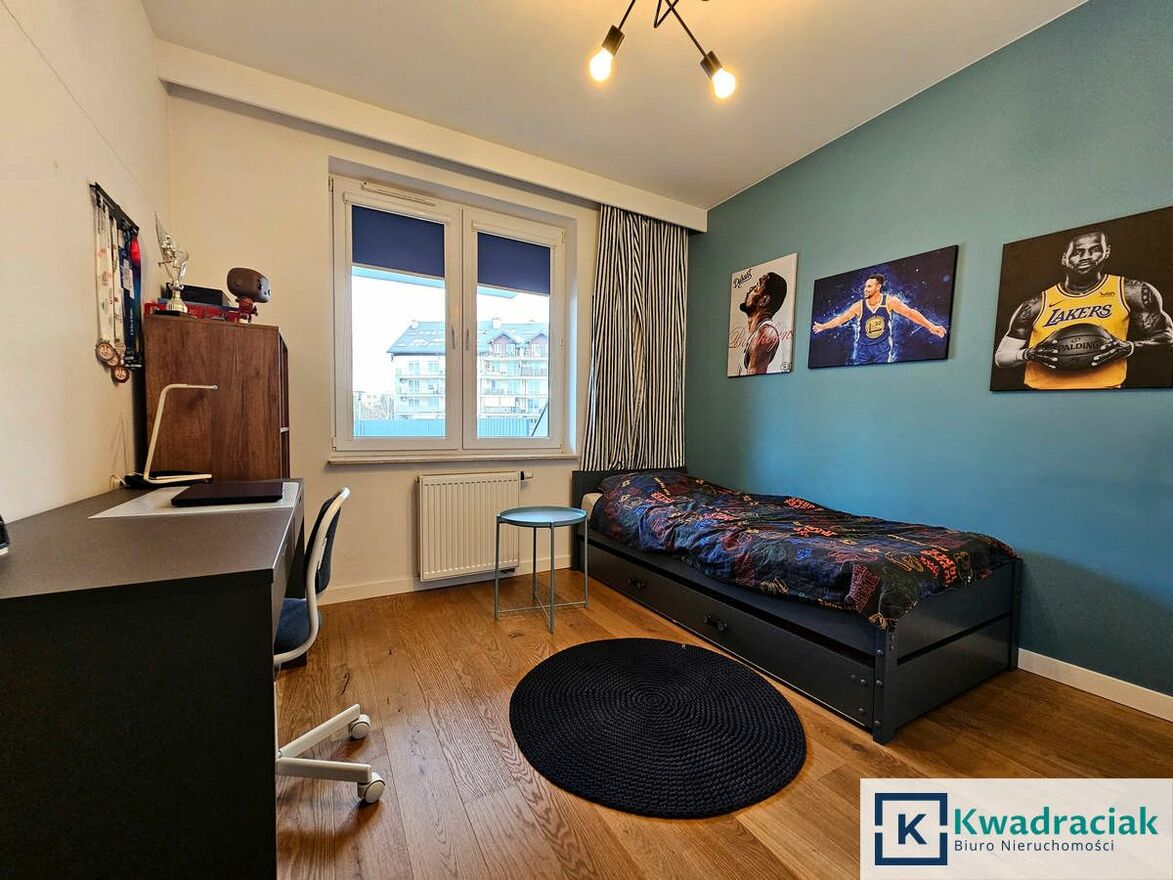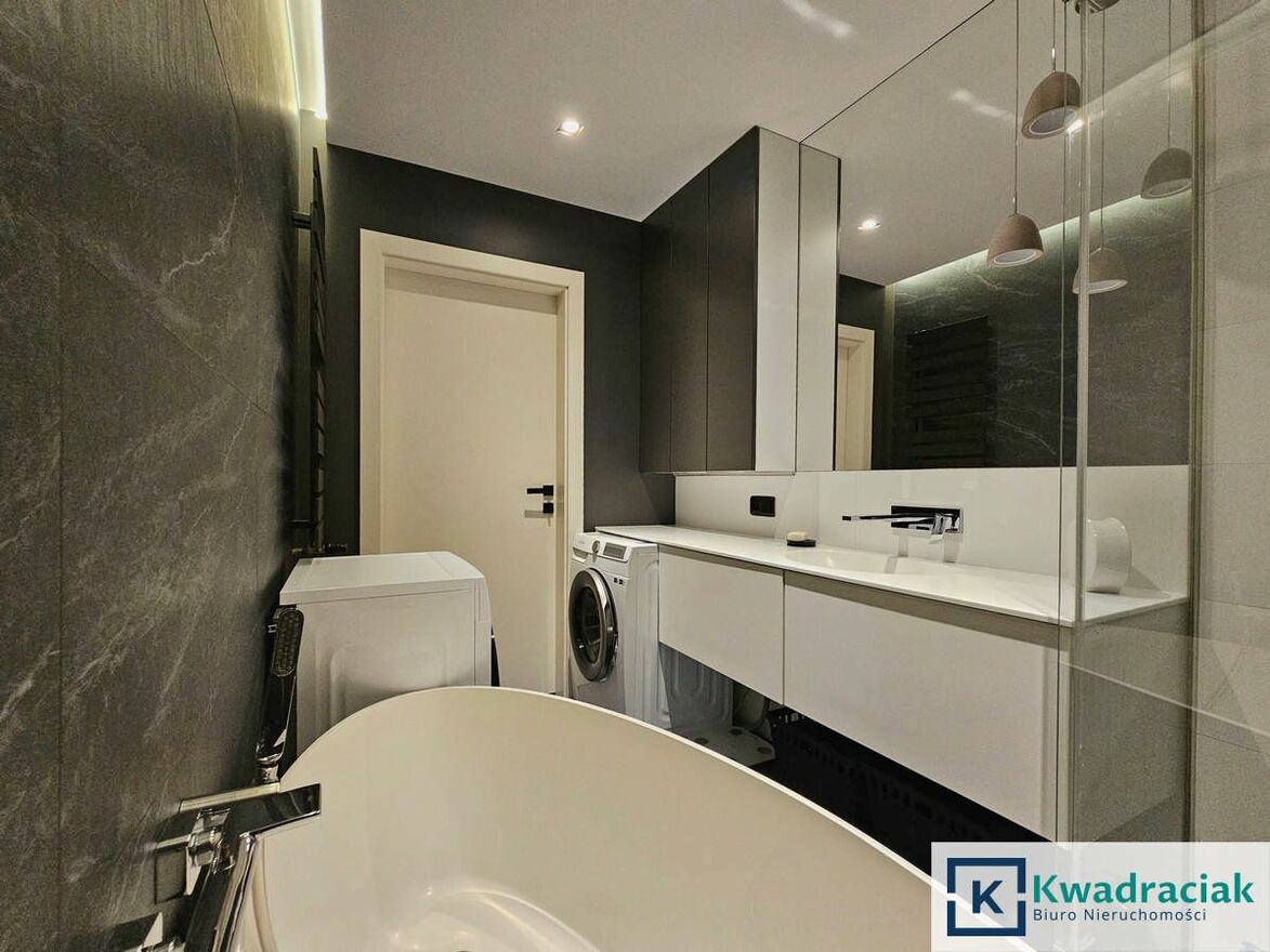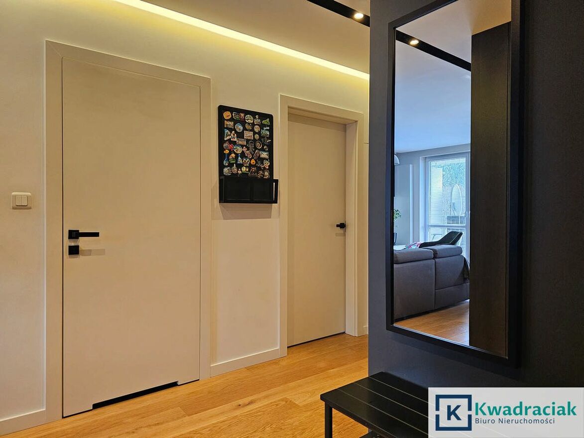 Mieszkanie o powierzchni użytkowej 67,47 m² znajduje się na parterze. Składa się z przestronnego salonu połączonego z kuchnią, z którego prowadzi wyjście na balkon o powierzchni 6,28 m², dwóch komfortowych sypialni, łazienki z ogrzewaniem podłogowym, oddzielnego WC również z podłogówką oraz korytarza z zabudową. Dodatkowym atutem jest duży, aż 63-metrowy taras, komórka lokatorska o powierzchni 4,26 m² oraz miejsce postojowe w garażu podziemnym. Mieszkanie jest wykończone w wysokim standardzie - umeblowane meblami wykonanymi na wymiar, wyposażone w kuchnię z marmurowym blatem, a na podłogach znajdują się drewniane panele Baltic Wood. Lokal jest klimatyzowany. Bardzo dobry stan oraz wysoka jakość wykończenia sprawia, że mieszkanie jest gotowe do wprowadzenia bez dodatkowych nakładów.