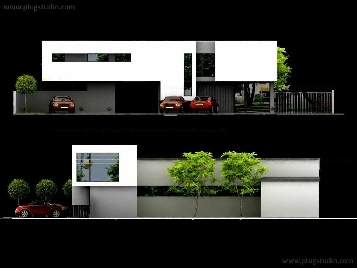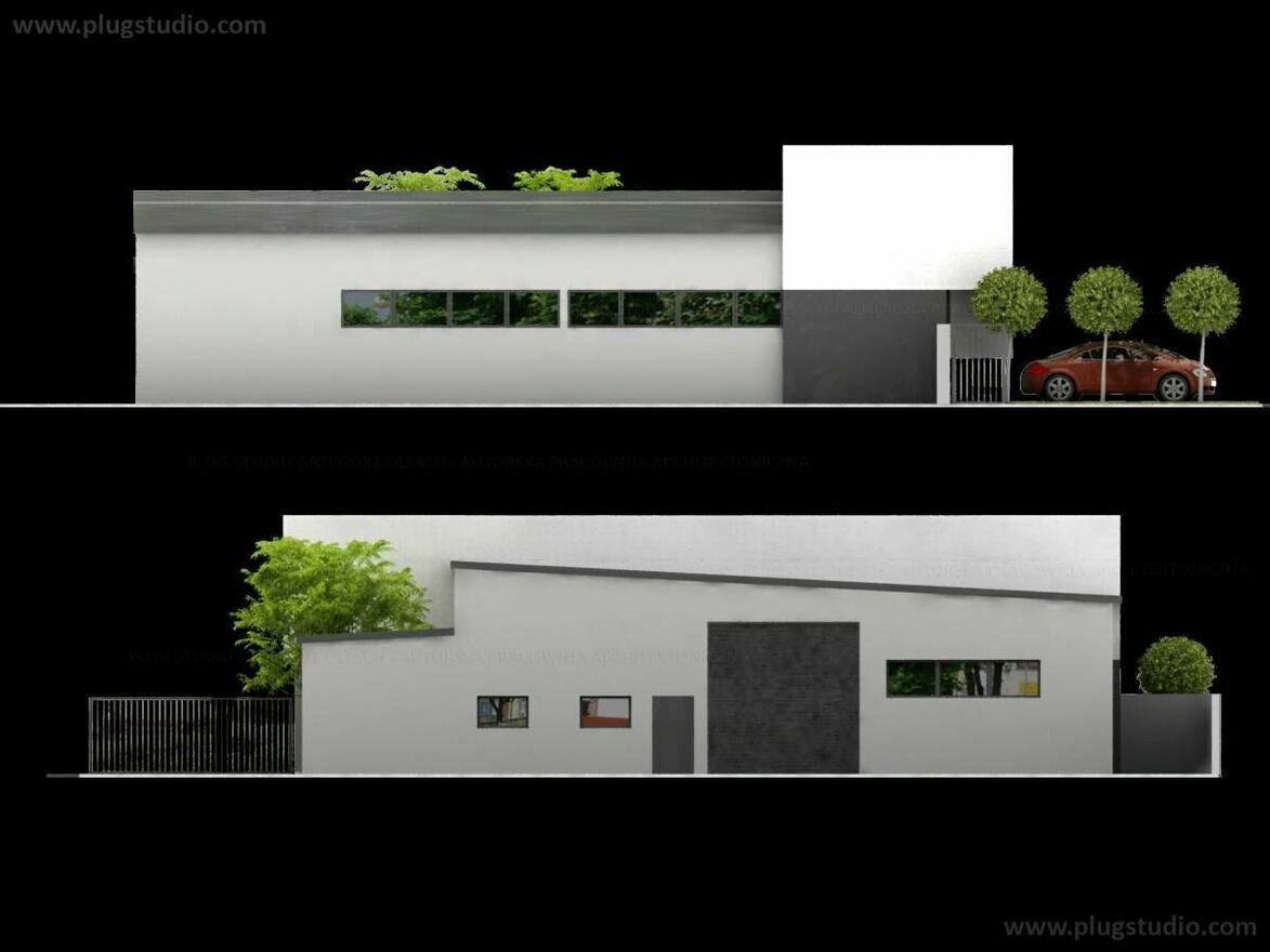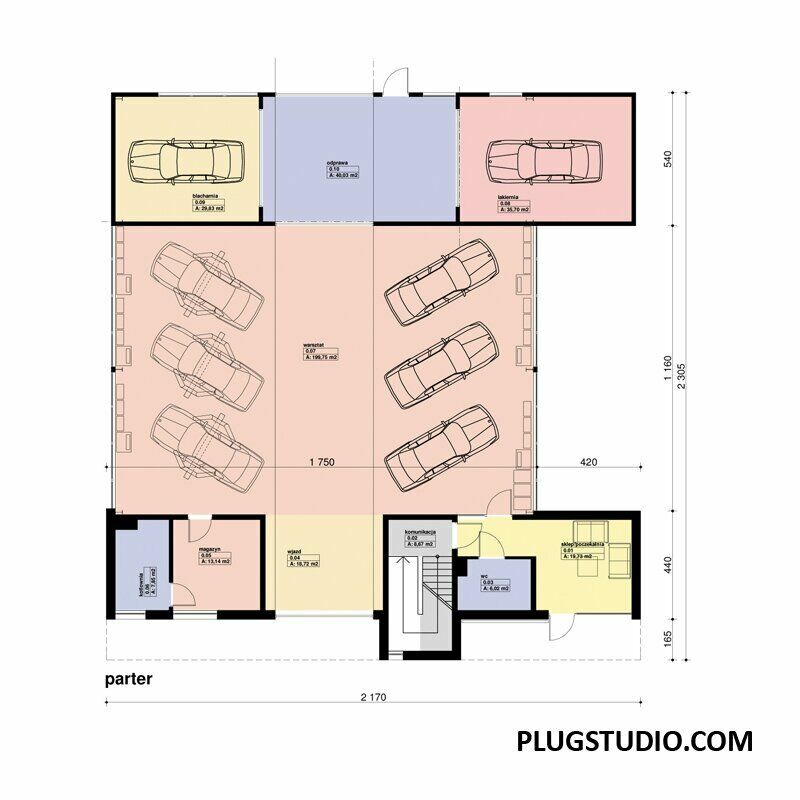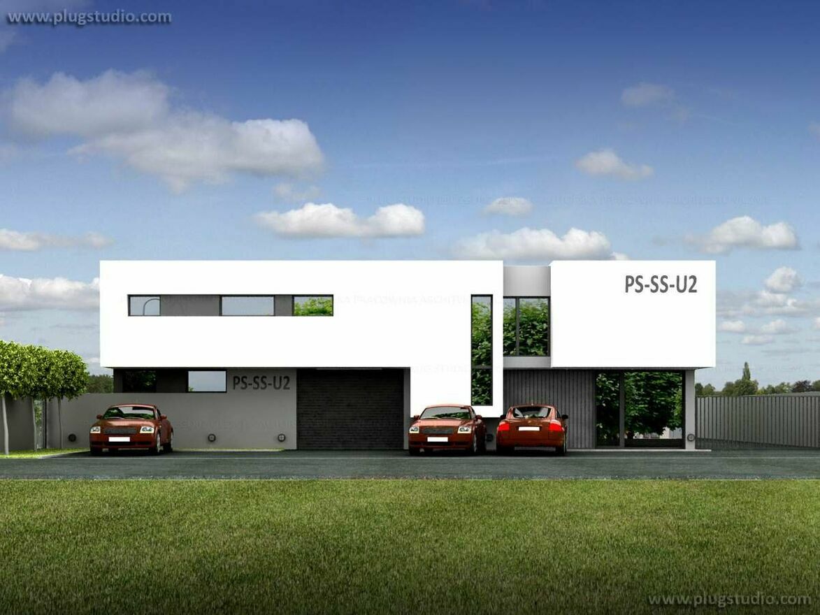 PROJEKT PLUGSHOP.EU STWÓRZ WŁASNE IDEALNE MIEJSCE PRACYWarsztat samochodowy. Nowoczesna bryła części biurowo-usługowej od frontu oraz hala warsztatowa w tyle działki.